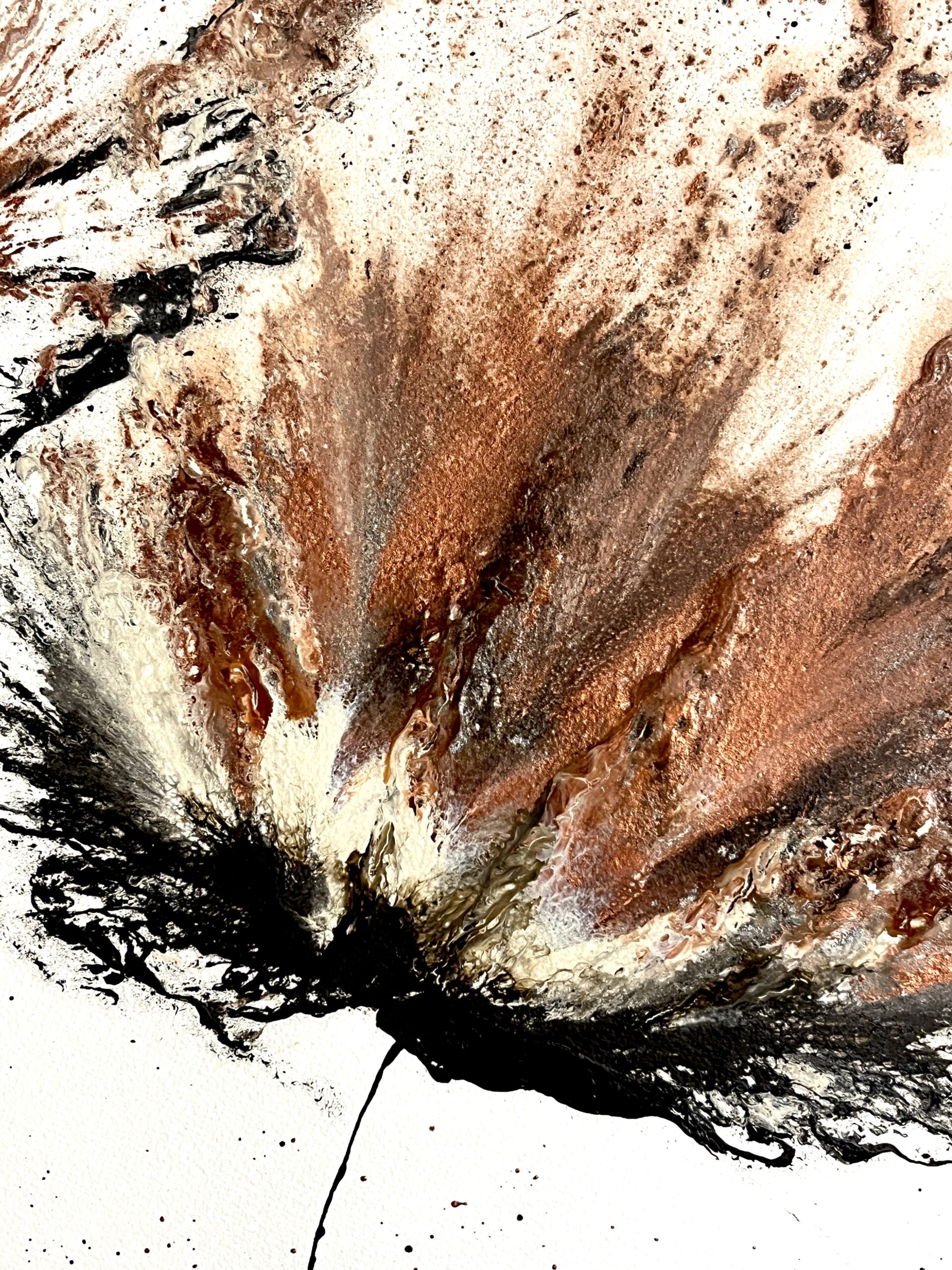 This original oversize contemporary flower painting presents in warm metallic hues of copper and deep brown with accents of silver on thick creamy cotton ragg paper. This earth tone flower art is 22 x 22 inches. MAT & FRAME NOT INCLUDED.
